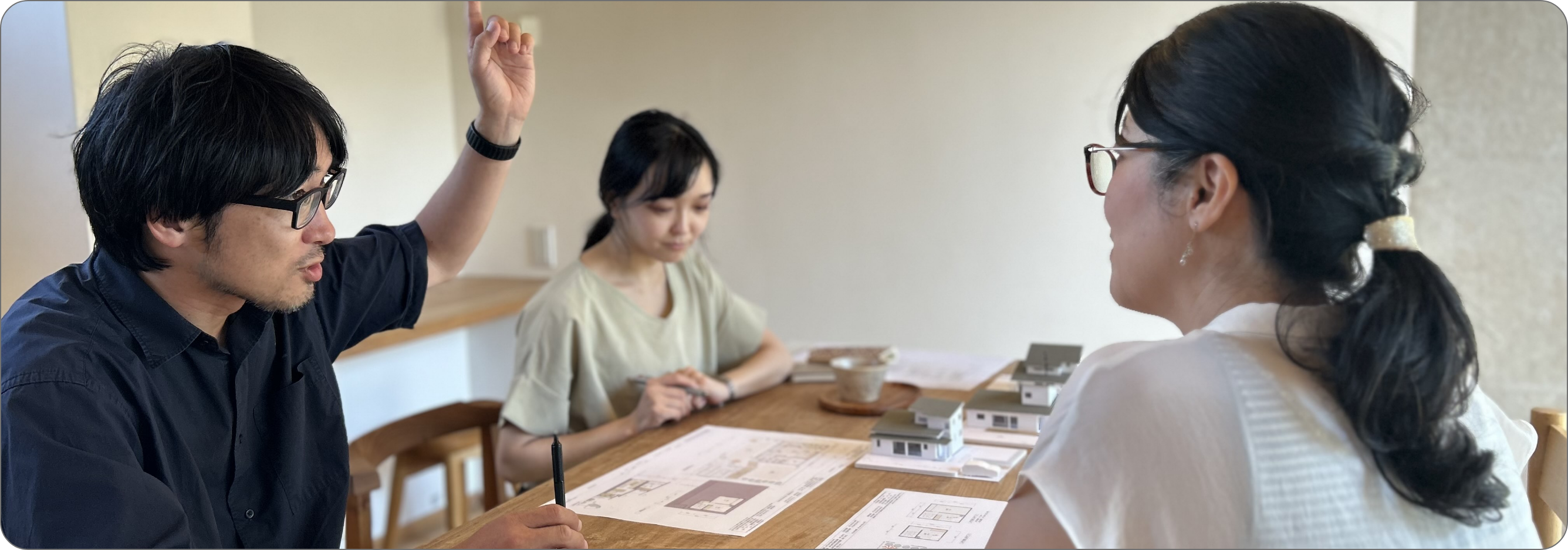 私たちは家を建てる際、必ずクライアントのなりたい未来の姿や形を一緒に考えます。「ただ綺麗な建物ではなく、街の価値を向上させるような空間が欲しい」「なんとなく立ち寄ってホッと一息つく。そんな店舗を作りたい」など、​その建物を建てることでクライアントがどのような未来を叶えたいのかを一緒に探るところからスタートします。